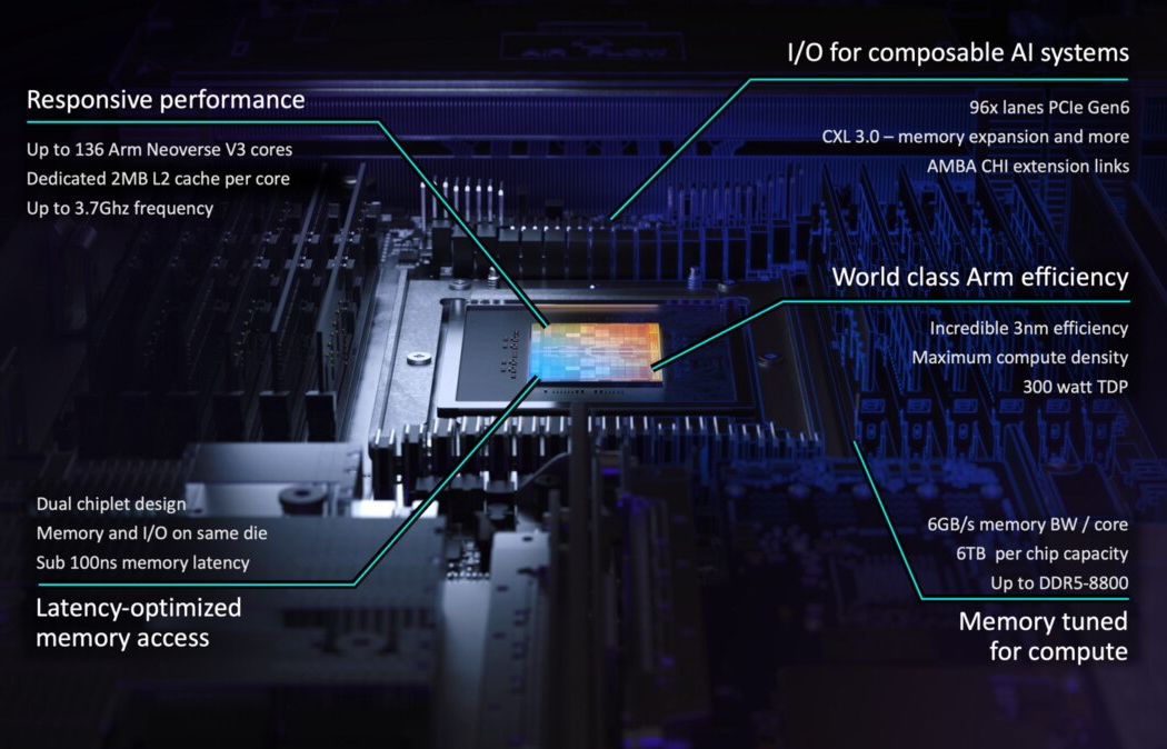 Baptisée AGI pour Artificial General Intelligence, la puce comprend 136 cœurs Neoverse v3 cadencés à 3,2 GHz pouvant monter à 3,7 GHz en mode turbo et affiche un TDP de 300 watt. Ils sont répartis sur deux dies gravés en 3 nm par TSMC. Le processeur intègre 2 Mo de cache L2 par cœur et 128 Mo de cache système partagé (SLC). Il prend en charge 12 canaux de mémoire DDR5 jusqu'à 8 800 MT/s, offrant une bande passante mémoire agrégée de plus de 800 Go/s, soit 6 Go/s par cœur, avec une latence inférieure à 100 ns. L'interface d'E/S comprend 96 lignes PCIe Gen6 et la prise en charge native de CXL 3.0 pour l'extension et le regroupement de la mémoire.
