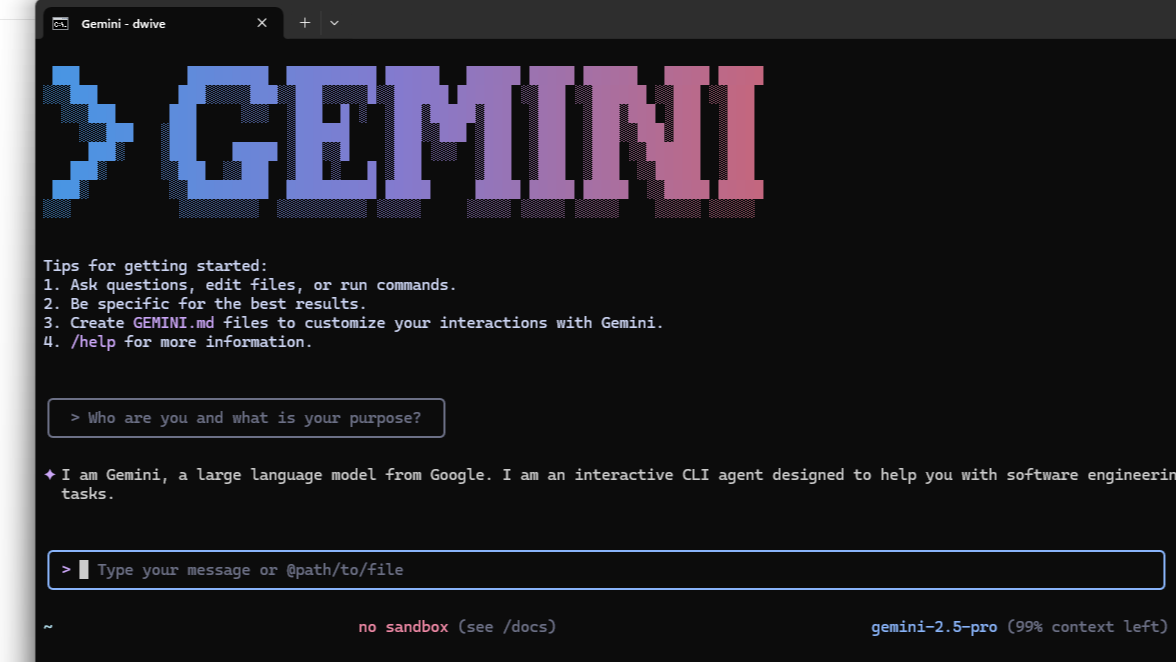 En utilisant soit Gemini CLI, soit LLxprt Code, vous pouvez vous authentifier auprès de Google et utiliser une quantité très limitée de leur modèle Gemini 2.5 Pro avant de devoir passer au modèle Gemini 2.5 Flash. Bien que Gemini prétend avoir une longueur de contexte de 1 million de jetons, l'expérience réelle montre qu'il ne tient pas réellement compte de tout cela. L'un des avantages des modèles Gemini est qu'ils peuvent directement analyser des fichiers PDF et effectuer d'autres tâches similaires.