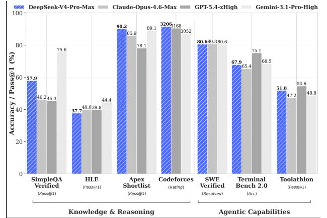 La société décline son LLM en deux versions au positionnement distinct. La version V4-Pro cible la performance maximale. Elle repose sur une architecture massive de 1,6 trillion de paramètres, dont 49 milliards activés dynamiquement via une approche mixture of experts. Selon l’éditeur, ce modèle a été entraîné sur environ 33 trillions de tokens. Il se positionne directement face aux modèles propriétaires les plus avancés, avec des performances revendiquées supérieures à Sonnet 4.5 et proches d'Opus 4.5, selon le protocole interne de DeepSeek. Sur les tâches de raisonnement, le modèle domine nettement sur Apex (90,2 %) et Codeforces (3206), et se montre compétitif sur HLE, tout en restant derrière Gemini sur SimpleQA. Côté capacités agentiques, les écarts se resserrent : DeepSeek atteint un niveau proche de ses concurrents sur SWE Verified (environ 80 %), mais se situe en retrait sur Terminal Bench et Toolathlon face à GPT-5.4.