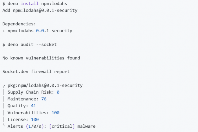 - Une sous-commande deno audit permet d'identifier les vulnérabilités de sécurité dans les dépendances en vérifiant la base de données GitHub CVE. Cette commande analyse et génère un rapport pour les paquets JSR et NPM.