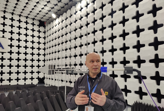 Marko Irkonen, directeur du laboratoire de vérification des radiofréquences, présente la chambre anéchoïque de Nokia pour homologuer les performances radios des équipements. (Crédit JC)