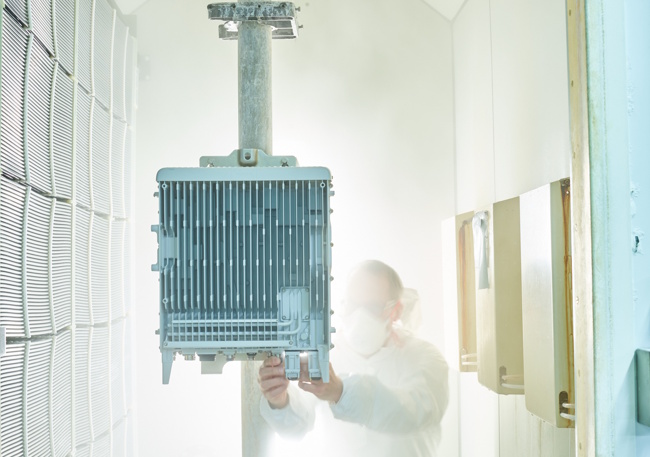 Le volet test est important pour garantir que les équipements délivrent les meilleures performances y compris dans des situations extrêmes. « Nous appliquons les standards en matière de test, mais il faut aller au-delà pour prendre en compte les demandes des clients », assure Jarkko Pyykkönen. Dans ce cadre, le site d’Oulu dispose à la fois de plusieurs bancs de test. Les stations de base sont ainsi soumises à différents traitements comme l’humidité pour évaluer la résistance à la corrosion (eau de mer par exemple), le froid (Oulu est un cadre idéal avec des températures polaires en hiver) ou la chaleur, les vibrations (des tests reproduisent les secousses sismiques).