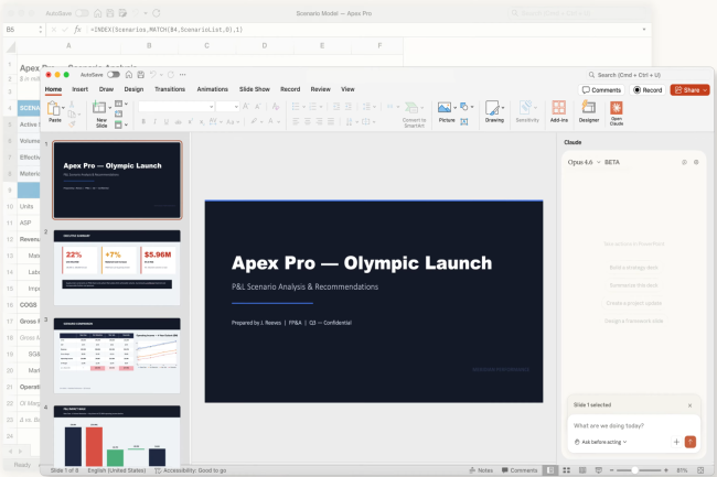 Enfin, Anthropic profite de la dernière évolution d’Opus pour mieux intégrer Claude dans PowerPoint de Microsoft. L’assistant est maintenant accessible en avant-première directement dans l’application via un panneau latéral pour les abonnés aux forfaits Max, Team et Enterprise. Auparavant, un utilisateur pouvait demander à Claude de créer une présentation PowerPoint, mais le fichier devait ensuite être transféré vers PowerPoint pour être modifié.
