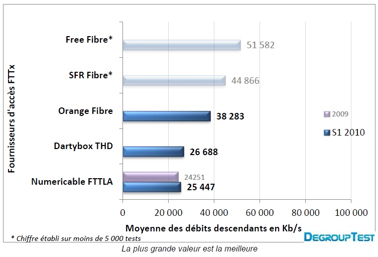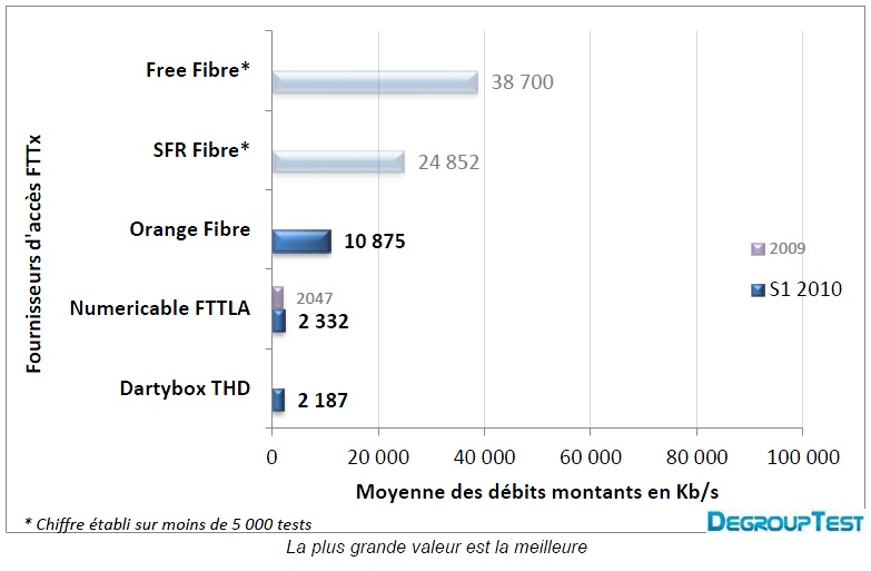 Orange domine le classement des fournisseurs d'accès en fibre optique en termes de débit descendant avec 38,3 Mbit/s. Il est suivi par l'offre de Dartybox avec 26,7 Mbit/s. Numéricable ferme la marche avec un débit descendant de 25,5 Mbit/s. Les débits mesurés sur les offres de fibre optique de Free et de SFR sont quant à eux très encourageants, avec des vitesses de 51,5 Mbit/s pour Free et de 44,9 Mbit/s pour SFR. La petitesse de l'échantillon analysé (moins de 5000 abonnés) a toutefois amené DegroupTest à écarter ces résultats. Pour l'instant.