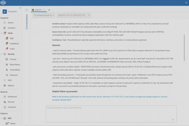 Forward AI diffère fondamentalement de la fonction AI Assist lancée en 2024, qui traduit les questions en anglais en requêtes à l'aide d'un modèle de données normalisé. Ce dernier agent construit de manière dynamique des plans d'exécution en plusieurs étapes qui atteignent à la fois le jumeau numérique interne et les systèmes externes tels que ServiceNow. « Il s'agit d'un système conversationnel agentique conçu pour simplifier l'ensemble des opérations », a expliqué Nikhil Handigol, cofondateur et directeur de l'IA chez Forward Networks. La différence pratique apparaît clairement dans les workflows de dépannage. Lorsqu'on lui demande de trier un ticket ServiceNow, l'agent lit le contenu du ticket, rassemble des informations contextuelles sur les entités mentionnées à partir du jumeau numérique, effectue automatiquement des traces de chemin pour les problèmes de connectivité et renvoie un diagnostic. Le flux de travail complet reste visible pour les opérateurs tout au long du processus. C’est donc très différent des simples requêtes en langage naturel où le système traduit une question et renvoie une réponse. L'agent élabore et exécute un plan qui peut impliquer plusieurs sources de données et étapes d'analyse.