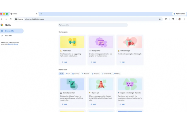 Les Skills sont enregistrés dans les sessions du navigateur de façon à les retrouver quelque soit le terminal de l'utilisateur. Parmi ceux proposés par l'éditeur, on trouve « Qu'y a-t-il là-dedans ? » pour la préparation et la planification des repas, « Créateur d'agenda » et « Transcription YouTube ». Habituellement, avec la GenAI les réponses à un prompt peuvent différer de celles obtenues pour un prompt identique répété. Le fournisseur indique que cela pourrait également se produire ici. « Comme toutes les réponses générées par l'IA, les résultats peuvent varier légèrement d'une exécution à l'autre, de la même manière que poser deux fois la même question à quelqu'un peut donner lieu à des réponses formulées différemment », a expliqué un porte-parole de Google dans un e-mail. « Les Skills de notre bibliothèque ont été évalués en termes de qualité et de fiabilité. »