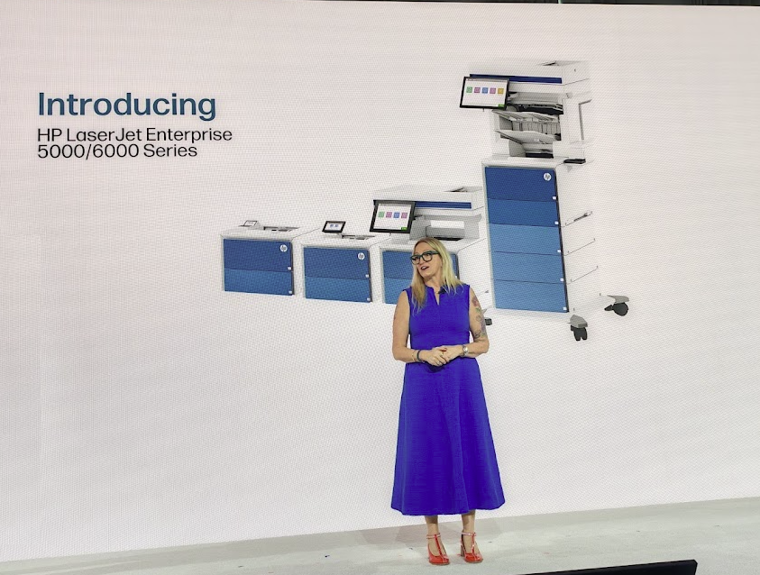 90% des pièces remplaçables des LaserJet peuvent être substituées en moins de huit minutes, ce qui limite les temps d'arrêt, a souligné Anneliese Olson, President of Imaging, Printing, and Solutions chez HP. (Crédit P.K.)