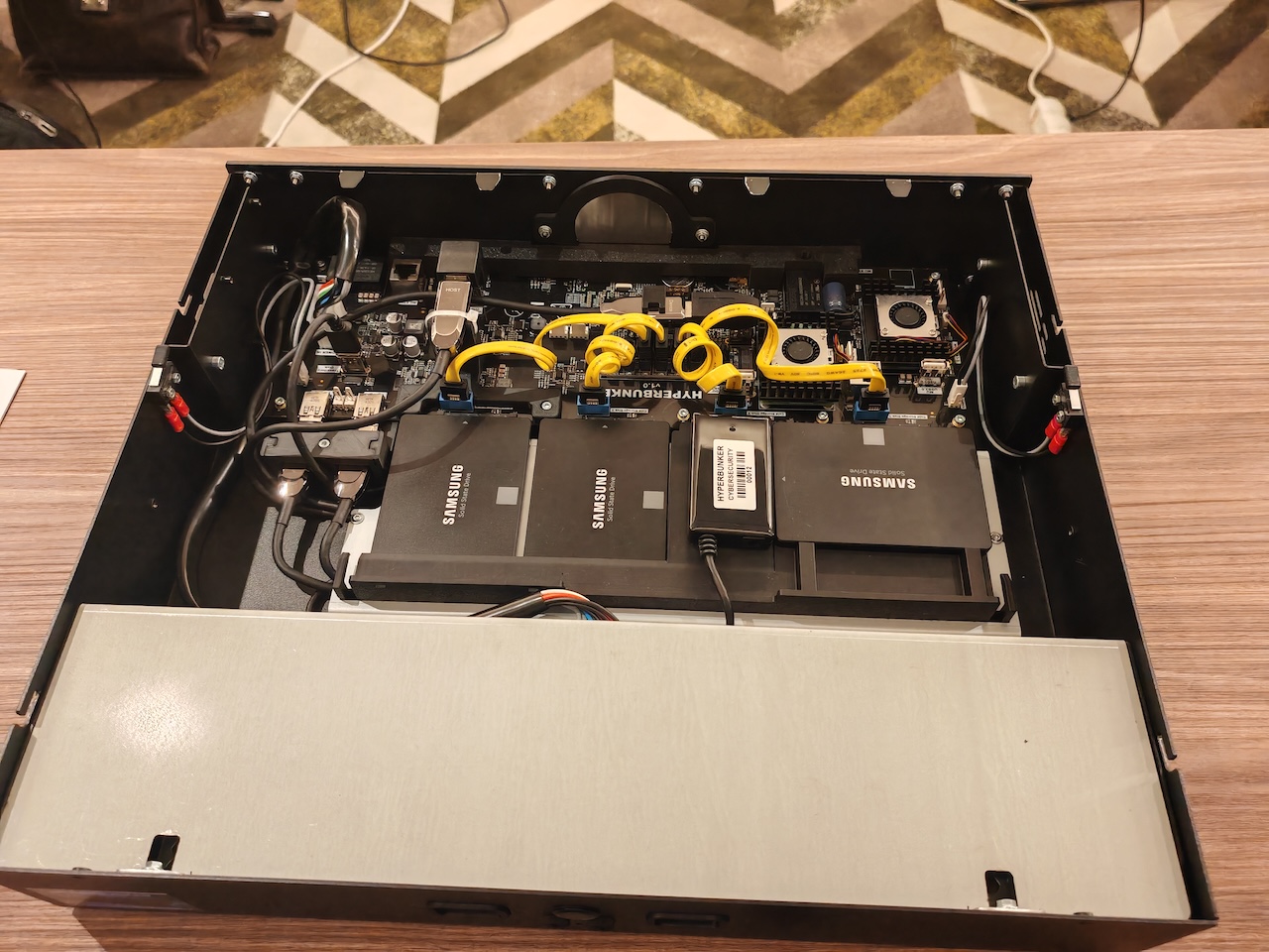 L'appliance d'Hyperbunker exploite trois puces Arm Cortex et trois SSD Samsung. On distingue bien sur cette photo le petit boitier de découplage optique entre les SSD. (Crédit P.K.)