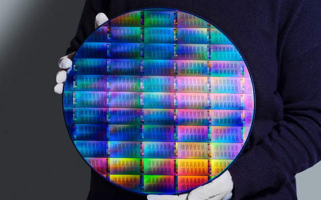 Un wafer de 300 mm de puces Nighthawk fabriqué dans l'usine Nanotech à Albany. (Crédit Photo: IBM)