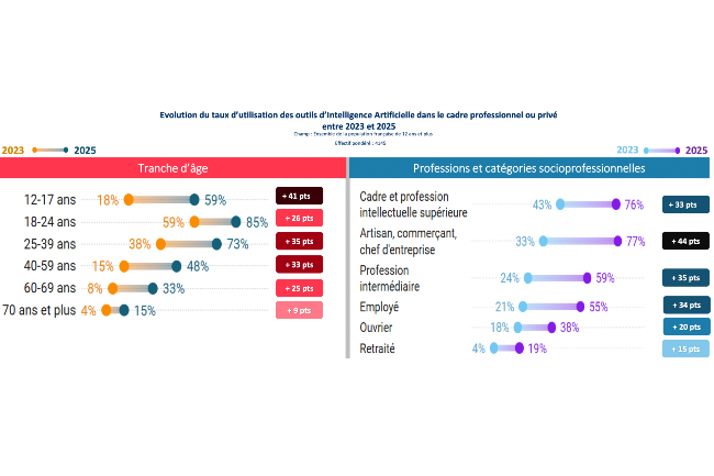 Si l’adoption progresse fortement, elle n’est pas répartie uniformément sur l’ensemble de la population. L’observatoire constate que les jeunes adultes notamment les 18-24 ans et les 25-39 ans constituent le plus fort bataillon des usagers de la GenAI ( 51% pour la première tranche d’âge et 46% pour la seconde). Les cadres, mais aussi les chefs d’entreprise adoptent cette technologie rapidement sous l’impulsion du développement des stratégies IA en entreprise. Les adolescents ne sont pas en reste avec une très forte progression du taux d’utilisation au grand dam des enseignants qui doivent composer à ces outils. Par contre, l’adoption reste en retrait chez les ouvriers, les retraités et les personnes âgées, constate l’enquête.