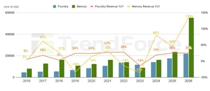 Trendforce s'attend à une explosion du marché de la mémoire en 2026, porté par l'inflation des prix, là où la gravure de processeurs connait une progression plus linéaire. (Source : Trendforce, fév. 2026)