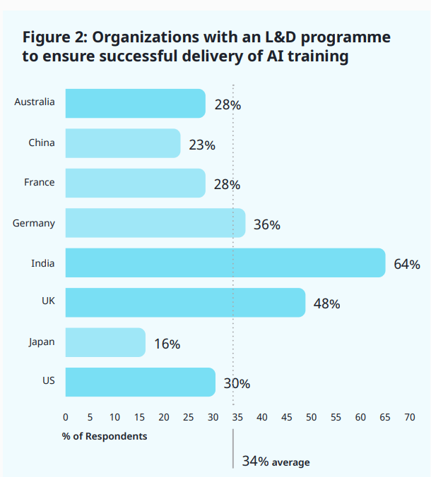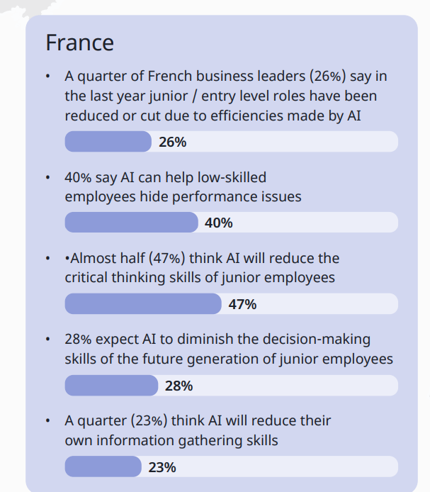 Parallèlement, en France, un tiers des répondants s’attend à des diminutions d’emplois de profils juniors du cours des 12 prochains mois. Ils sont également 40 % à estimer que les agents virtuels peuvent aider les employés peu qualifiés à masquer leurs problèmes de performance. Près de la moitié (47 %) vont même jusqu’à affirmer que l'IA réduira les capacités de réflexion critique des employés juniors tandis que 28 % s'attendent à ce qu’elle freine leurs aptitudes décisionnelles. De leur côté, un quart des dirigeants français pense que l'IA réduira leurs propres capacités de collecte d'informations. . il apparaît aussi que seules 28 % des entreprises en France disposent d'un programme d'apprentissage et de développement visant à garantir la réussite d’une formation à l'IA.