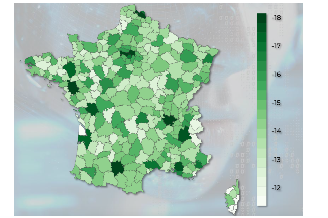 Les grandes métropoles comme Paris ou Lyon sont très exposées, tandis que le Médoc, la Corse ou le Nord-Atlantique restent protégés grâce aux métiers manuels et au tourisme. (Crédit: Coface)