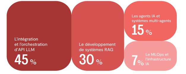 Les rythmes d’adoption varient selon la taille des organisations, mais la trajectoire est universellement à la hausse. Dans les PME (moins de 1 000 employés), la demande en freelances qualifiés en IA a plus que doublé ; les grandes entreprises, de leur côté, affichent une croissance stable et soutenue de +25%. Les besoins sont structurés autour de quatre grandes typologies de projets. 45% demandes concernent l’intégration et l’orchestration de LLM, 35%portent sur le développement de systèmes RAG, 15% sur les agents IA et les systèmes multi-agents, et 7% concernant le MLOps et l’infrastructure IA.