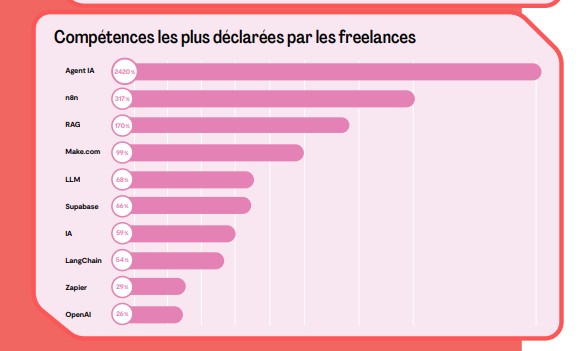 Si les langages historiques comme Python ou Java restent largement utilisés, ils sont de moins en moins mis en avant par les freelances qui rejoignent la plateforme. Leur présence parmi les compétences déclarées recule ainsi de 20 à 30 % en un an, signe d’un repositionnement progressif des profils vers des expertises plus récentes ou différenciantes. A l'inverse, l’étude montre une montée en puissance pour les compétences low/no-code. Pour exemple, l’outil n8n a vu son usage multiplié par 14, au point d’atteindre des niveaux comparables à ceux de technologies plus établies comme Java.