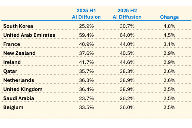 Le rapport met également en évidence des disparités régionales importantes malgré la croissance générale de l’adoption de l’IA générative. À l’échelle mondiale, l’usage de ces outils est passé de 15,1 % de la population totale au premier semestre 2025 à 16,3 % au second semestre, ce qui signifie qu’à la fin de l’année, près d’une personne sur six dans le monde s'est servie de cette technologie. Cependant, un écart se creuse entre les pays de l’hémisphère Nord plus riches et numérisés où le taux de conversion est de 24,7% à la fin 2025 et les pays de l’hémisphère sud qui affichent un taux de 14,1%.