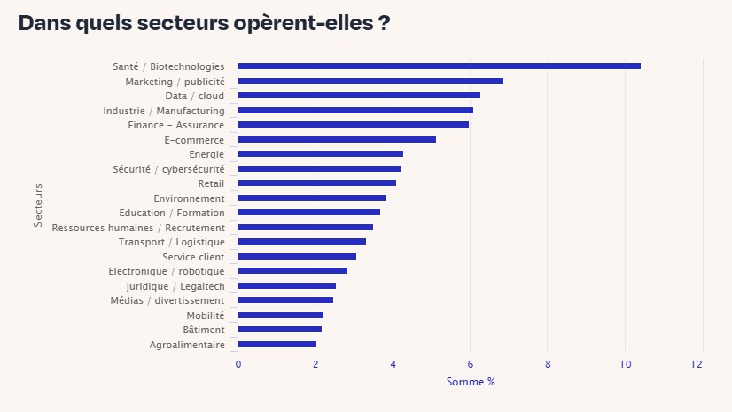 La santé (10,4 %) et le marketing (6,9 %) arrivent en tête des secteurs d’activité suivis de près par la data et le cloud (6,3 %), l'industrie (6,1 %) ainsi que la finance et l'assurance (6 %). Leurs solutions s'adressent principalement aux directions marketing (14 %), aux directions et administrations générales (6 %), ainsi qu'aux équipes en charge de la relation client (6 %).