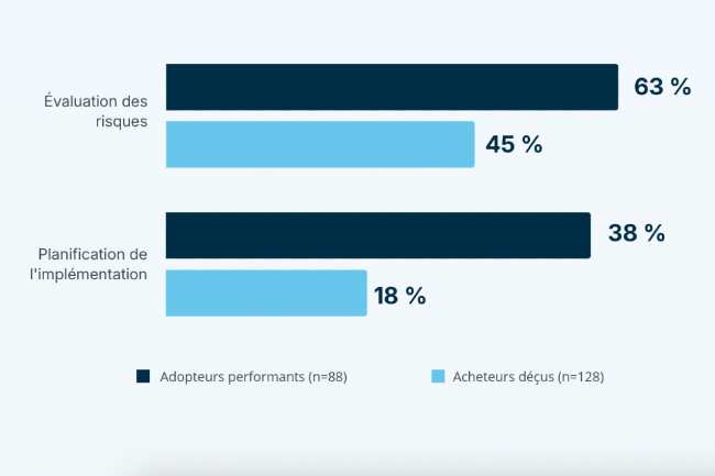 Les sociétés satisfaites se distinguent par une meilleure gestion des risques (63 %) et une planification plus rigoureuse de l’implémentation (38 %), contre respectivement 45 % et 18 % chez les acheteurs déçus. (Crédit: Capterra)