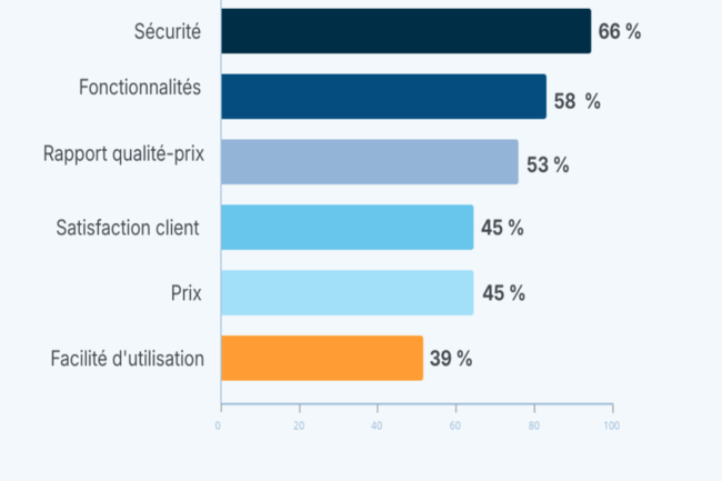 En France, les entreprises les plus performantes privilégient avant tout la sécurité, les fonctionnalités et le rapport qualité-prix lors de l’adoption de logiciels. (Crédit: Capterra)