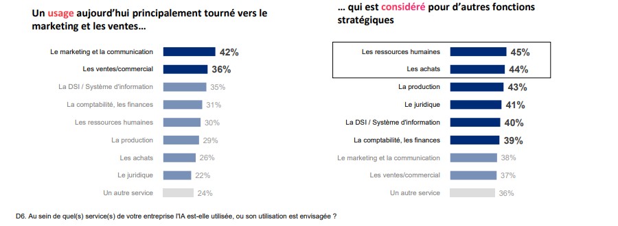 Du point de vue des métiers, en France, la GenAI est principalement déployée dans les services marketing (42 %) et commerciaux (36 %). Son usage est envisagé à moyen terme dans d’autres fonctions stratégiques, comme la production (43%), le juridique (41%) et la DSI (40%). L’étude met également en évidence un écart de maturité entre les entreprises de grande taille et le reste du tissu économique. En effet, 52 % d’entre elles considèrent les assistants IA comme prioritaires, contre 38 % seulement des petites organisations.