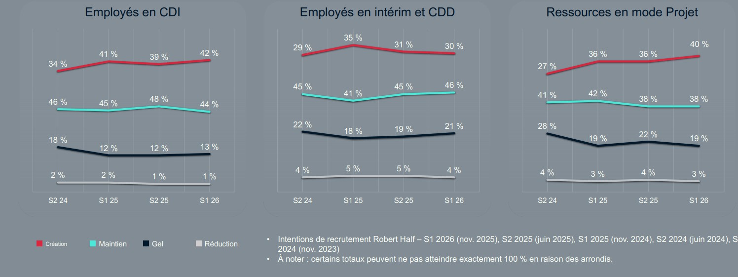 « Nous observons un glissement stratégique majeur : avant de déployer massivement l’IA et le cloud, les entreprises ont compris qu’il était impératif de sécuriser leurs fondations. Raison pour laquelle une grande entreprise sur deux recrutera des experts en cybersécurité en ce premier semestre 2026 » analyse Quentin de Beaufort, directeur du recrutement pour les fonctions IT, digital et entes chez Robert Half dans un communiqué. L’étude confirme en parallèle la solidité du marché de l’emploi numérique avec des intentions d'embauche en hausse au 1er semestre 2026. Ainsi, 42% des recruteurs prévoient de créer des postes en CDI dans les fonctions techniques au cours des six premiers mois (+3 points par rapport au semestre précédent).
