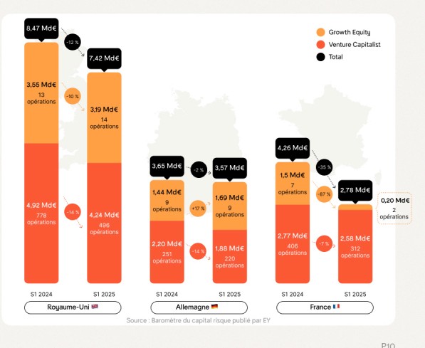 Levées de fonds en France vs en Allemagne et au Royaume-Uni en 2025. (Source: France Digitale)