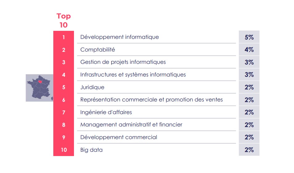 Par famille de métiers, début 2026, le développement informatique est arrivé en tête du top 10 des offres d’emploi à destination des cadres à Paris et dans sa périphérie, avec 5% des propositions, devant la gestion de projets IT ainsi que les infrastructures et les systèmes (3%) puis le big data (2%). Même chose en Auvergne-Rhone-Alpes et en PACA/Corse qui placent les développeurs, les chefs de projets et les spécialistes des infrastructures dans le top trois des postes pourvoir. Enfin, des niveaux élevés de recrutements de cadres IT sont à prévoir en Occitanie et en Bretagne, tandis que la Normandie et le Grand Est devraient retrouver de la stabilité.