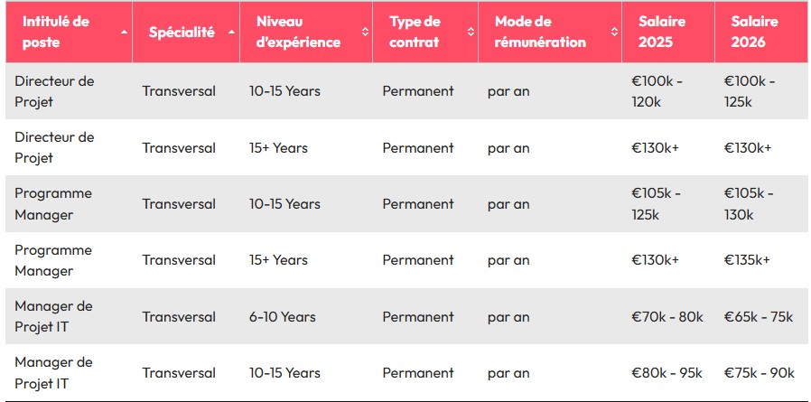Prévisions de salaires 2026 dans le pilotage de projets de transformation. (Source Robert Walters)
