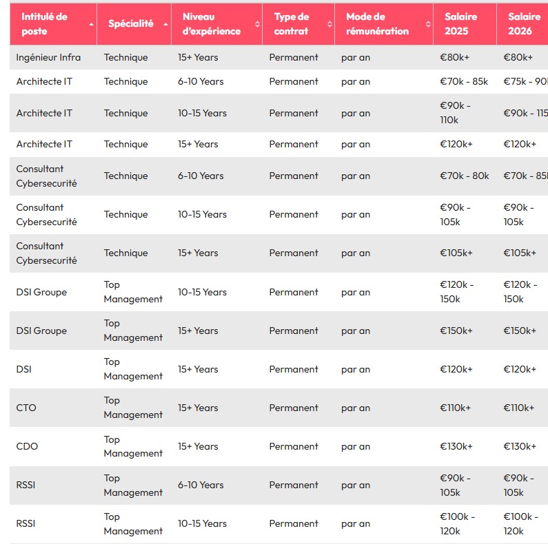 Prévisions de salaires 2026 dans les métiers RSSI, DSI, architecte,... (Source: Robert Walters)