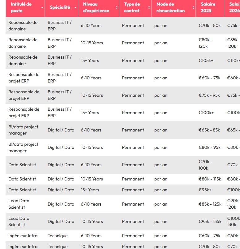 Prévisions de salaires d026 dans les métiers des domaines, des ERP, des data et des ingénieurs infra. (Source: Robert Walters)