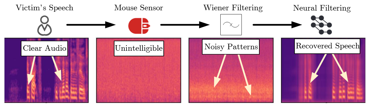Même si les signaux captés étaient inaudibles au départ, l'équipe a pu les améliorer à l'aide d'un filtrage statistique Wiener et d'un réseau neuronal afin d'augmenter la puissance du signal par rapport au bruit. Comme le montre la vidéo de démonstration de ce processus, les chercheurs ont pu extraire des mots prononcés à partir d'un flux de données intercepté qui, au départ, semblait impossible à déchiffrer. « Grâce à notre pipeline Mic-E-Mouse, les vibrations détectées par la souris sur le bureau de l'utilisateur victime sont transformées en un signal audio complet, qui permet à un pirate d'écouter des conversations confidentielles », ont écrit les chercheurs. De plus, selon eux, ce type d'attaque serait indétectable par les systèmes de défense : « Ce processus est furtif, car la collecte des signaux de vibration est invisible pour l'utilisateur victime et ne nécessite pas de privilèges élevés de la part du pirate. »
