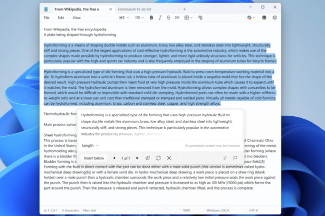 Les fonctions IA de Bloc-notes montrent un aperçu progressif du texte grâce à l’affichage en temps réel. (Crédit: microsoft)
