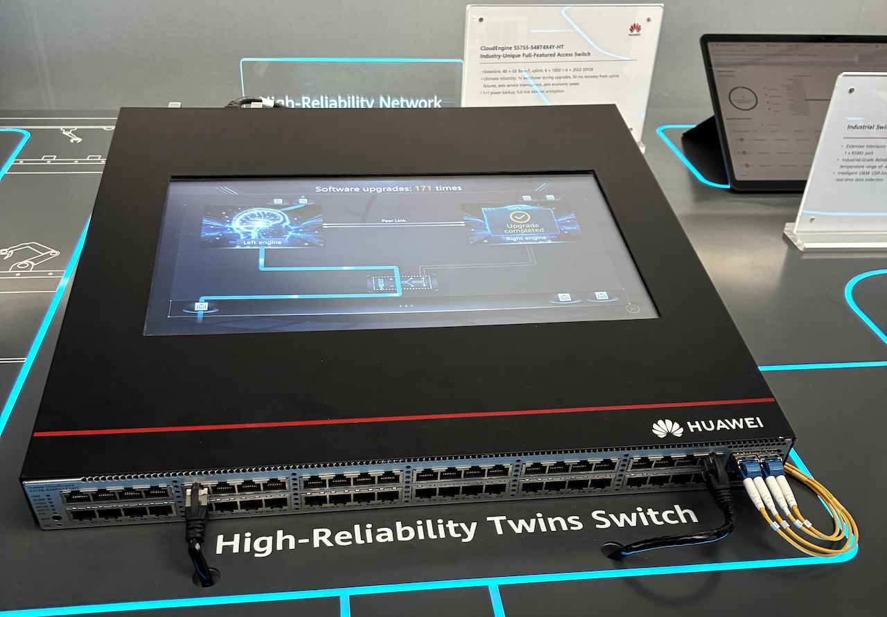 Sur le segment filaire, Huawei a présenté un switch multimatrix intégrant deux plans de contrôle (deux puces réseau distinctes) fonctionnant en mode actif-actif, mais partageant un unique plan de trafic L'objectif est d'assurer la continuité du service lors des mises à jour logicielles, un scénario critique dans les environnements hospitaliers ou industriels où toute interruption est inacceptable. « Nous avons conçu fait un switch Multimatrix. Même si vous plantez le plan de contrôle, le plan de transfert continue. C'est vraiment pour pouvoir faire de l'upgrade à chaud sans interrompre le réseau », résume Christophe Batiard. Huawei décline par ailleurs ses switches en versions industrielles, avec des ports et fonctionnalités identiques aux modèles classiques mais durcis pour les environnements de type usine, comme ceux déployés chez le constructeur automobile chinois BYD. L’équipementier mise sur l’augmentation des capacités de chiffrement et de déchiffrement sur ces plates‑formes Ethernet afin de répondre aux besoins croissants en sécurité, tout en conservant un contrôle automatisé via ses contrôleurs SDN maison.
