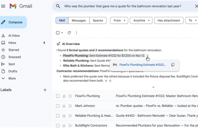 - Gmail intègre Gemini. Google franchit une étape importante en matière d'IA en annonçant l'intégration de Gemini dans sa solution de messagerie. Parmi les fonctions qui vont tirer partie de cet outil : AI Overviews pour résumer les conversations et retrouver plus facilement des informations contenant dans des échanges, Help Me Write et Suggested Replies pour reformuler du texte et améliorer les tournures grammaticales. Sans oublier également AI Inbox pour faire remonter les messages les plus importants, aider à identifier ses contacts les plus importants à partir d'indicateurs tels que les personnes à qui des mails sont envoyés le plus fréquemment, qui figurent dans sa liste de contacts, ainsi que les relations déduites du contenu des messages.