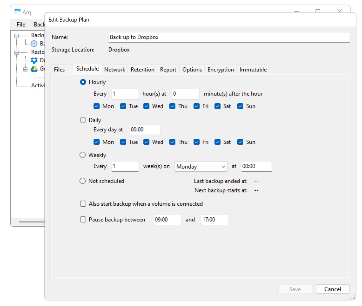 Arq 7 prend en charge plusieurs tâches (appelées « plans de sauvegarde » dans le jargon Arq) que vous pouvez adapter à chaque service ou appareil particulier. Vous pouvez par exemple sauvegarder vos documents importants sur un service cloud gratuit et tous vos fichiers sur un compte plus spacieux, un disque dur local, un boîtier NAS, etc. La liste des options prises en charge par Arq 7 Backup est longue : planification granulaire, limitation du transfert réseau et sélection de l'interface, règles de conservation étendues, rapports par e-mail, paramètres de cryptage, fichiers immuables (verrouillage d'objets) et une multitude d'options d'alimentation/d'alerte/de performance.
