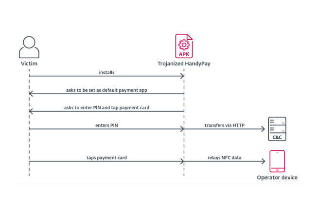 Les chercheurs d'Eset font remarquer que cette campagne marque un changement de méthode des opérateurs de NGate : au lieu d'utiliser des outils personnalisés, ils ont opté pour une application légitime infectée par un cheval de Troie. Initialement conçue pour relayer des données NFC entre terminaux, l’application HandyPay limite l’opération de paiement à des autorisations minimales et se fond dans les flux de transaction habituels. Cette approche évite d’avoir à créer des outils sur mesure à partir de zéro, comme ce fut le cas lors de l'exploitation abusive de NFCGate, et elle consiste plutôt à injecter du code malveillant dans une application existante compatible NFC.
