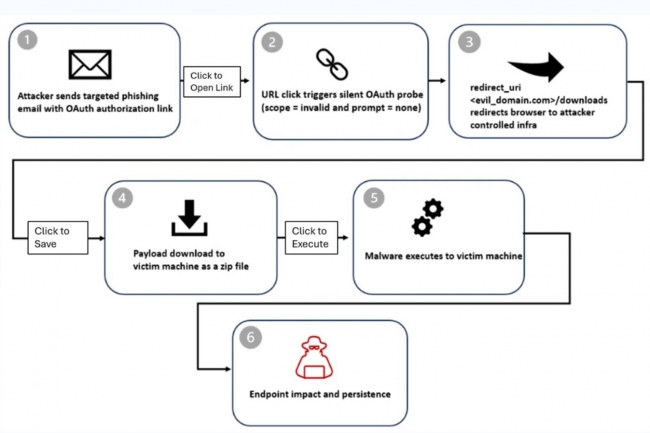 L'attaque commence par un courriel de phishing comportant différents leurres comme des demandes de signature électronique, des communications RH, des invitations à des réunions Microsoft Teams et des alertes de réinitialisation de mot de passe. « Les liens malveillants sont intégrés soit dans le corps du courriel, soit dans une pièce jointe PDF », ont précisé les chercheurs de Microsoft dans leur billet de blog. Le lien pointe vers un véritable point de terminaison d'autorisation OAuth, mais il est construit avec des paramètres délibérément erronés. Les attaquants utilisent une valeur « prompt=none », demandant une authentification silencieuse sans écran de connexion, et l'associent à une valeur de portée invalide. Cette combinaison est conçue pour échouer. Lorsque c'est le cas, le fournisseur d'identité redirige le navigateur de l'utilisateur vers une URI (Uniform Resource Identifier) enregistrée par l'attaquant. « Même si ce comportement est conforme aux normes, les adversaires peuvent en abuser pour rediriger les utilisateurs via des points de terminaison d'autorisation fiables vers des destinations contrôlées par les attaquants », ont mis en garde les chercheurs.