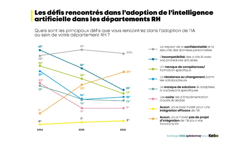 Les obstacles à l'adoption de l'IA dans la fonction RH entre 2024 et 2026. (Source:Opinionway/kelios)