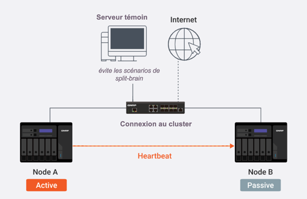 La solution de haute disponibilité de QNAP repose sur un cluster actif/passif composé de deux NAS identiques, synchronisés en temps réel via SnapSync. En cas de panne du nœud principal, le système bascule automatiquement vers le nœud secondaire, avec un RTO (Recovery Time Objective) inférieur à 60 secondes.