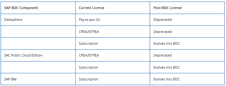 BDC n'est pas fourni avec SAP RISE, et il n'existe aucun plan pour que cela change. Les clients existants peuvent continuer à utiliser leur modèle de licence actuel jusqu'au renouvellement, après quoi une restructuration pourrait être nécessaire.